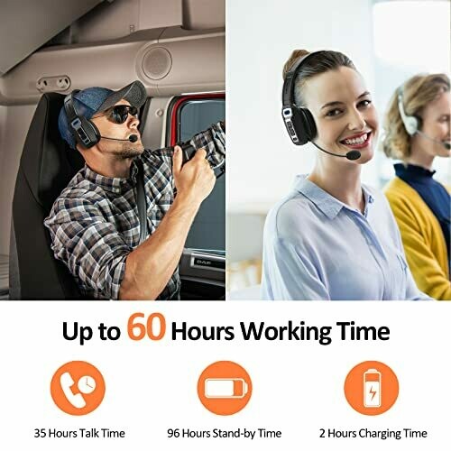 - 60 hours super battery life This Trucker bluetooth headset is equipped with a large 400mAh battery, which is specially designed for truck drivers to travel long distances or for business travelers. This wireless headset can be fully charged in just 2 hours, supporting up to 60 hours of work/music time and 35 hours of talk time. Provides plenty of power to stay connected during long-distance work, music time to relieve fatigue, and soft ear earmuffs for all-day comfort.