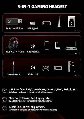• No worries about tangled wires - 3 Connection Methods & More Device Support: 1) 2.4GHz wireless connection support: PS4/5, laptops, desktops, MAC, Switch (due to incompatible host models, peripheral microphones are not available). 2) Bluetooth connection support: Phone, Pad, Laptop. 3) 3.5mm wired connection support: PS4/5, Switch, PC, Xbox series (host only supports wired connection).