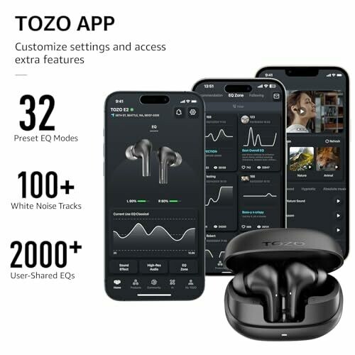 - Customize 32 EQs with TOZO App: Use TOZO app to customize your listening experience and choose from 32 EQ presets.