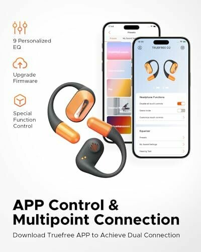 - APP control & multipoint connection: Download the “Truefree" APP on the APP store. With Truefree APP, you can easily customize your control function like game mode, adjust the EQ to tune the optimal sound and update the firmware. Choose the "Dual Device Connection" in the APP, you can connect earbuds to two devices, and can easily switch music, videos, calls, and more between 2 devices.